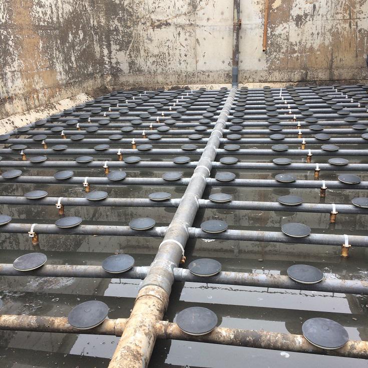 河南山水環(huán)保微孔棕剛玉曝氣器,其曝氣膜片和支承托盤呈球冠形結(jié)構(gòu),特性參數(shù)為:直徑(Φ)240 mrn、厚度(δ)38 mm、氣孔率30%-35%、氣孔直徑250μm。另外四種為吉化污水廠自行研制的剛玉中微孔曝氣器,分別稱為A型、B型、C型、D型,其外型構(gòu)造、脫氣材料等與WZP型曝氣器相仿,只是曝氣頭擴(kuò)散盤直徑和微孔材料厚度略有不同,分別為 A型:Φ=178 mm、δ=19mm;B型:Φ=178 mm、δ=35 mm人型:C型:Φ=230 mm、δ=19 mm;D型:Φ=240 mm、δ=20 mm。